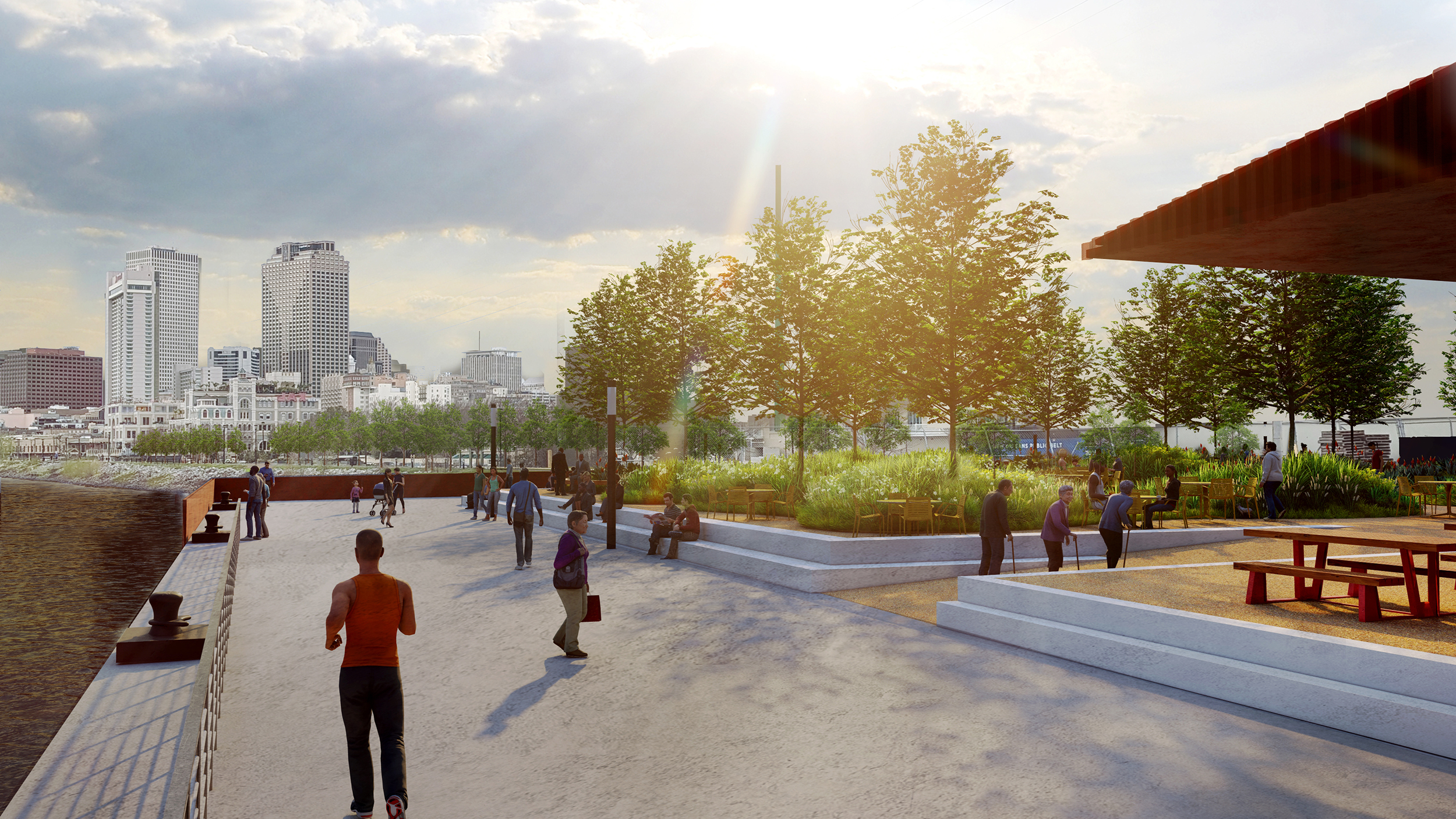 The Governor Nicholls Wharf project transforms a critical stretch of New Orleans’ industrial riverfront into a dynamic public green space. The heart of the park includes plazas and expansive lawns that anchor the area with community-oriented programming including the adaptive reuse of the wharf structure as a Cultural Shed. Play areas, inspired by marsh creatures, engage children in learning about the surrounding landscape, wetland ecosystems, and their crucial role in river health. The planting includes a rich landscape of trees, native grasses, and pollinator-friendly plants. A continuous promenade creates a linear river edge experience and shaded pavilions further invite relaxation and connection. This project reclaims a historically private industrial site, celebrating New Orleans’ heritage through ecology, education, and inclusive public access.